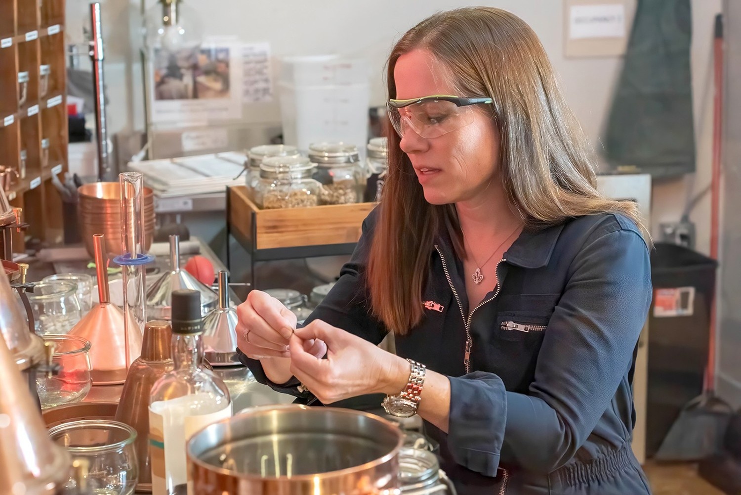 To create Alpine Distilling’s signature spirit, Sara uses various classic gin botanicals like juniper, coriander, and angelica root sourced from places including Croatia, Egypt, and France. For the distilling process, she utilizes vapor distillation, which elevates each botanical for clarity, balance, and consistency.