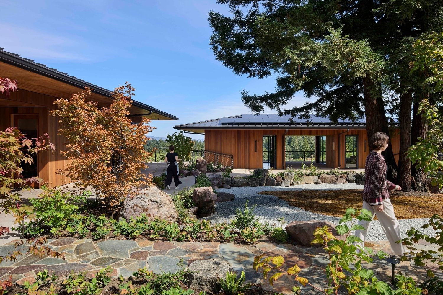 Hinting at the clean lines of Asia, the winery conveys intentionality. Architect Juancarlos Fernandez of Signum Architecture laid out three low-slung buildings around a heritage redwood, linking them with simple walkways so the structures read as a small compound rather than one monolithic room. Landscape architect Hoichi Kurisu, long associated with the Portland Japanese Garden, shaped the courtyard and plantings so each path and window frames a slice of sky, tree, or vine.
