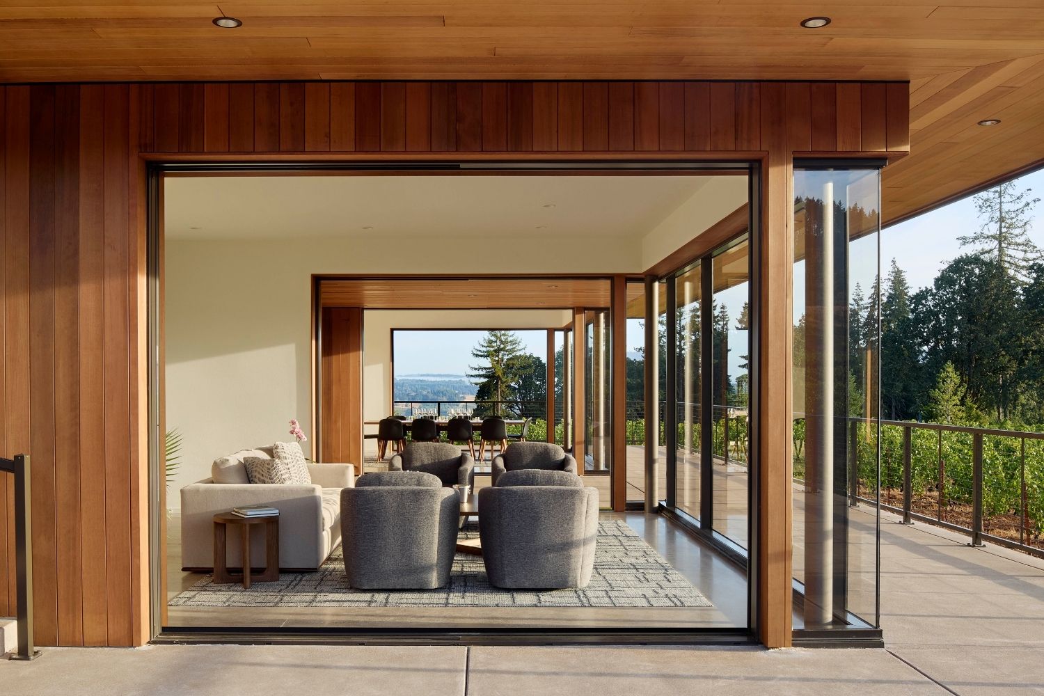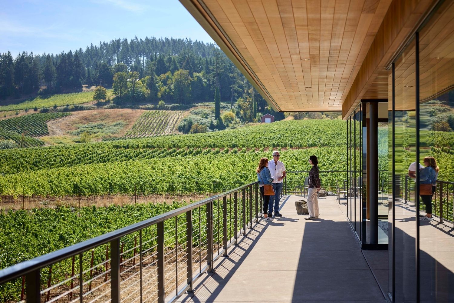 On approach, a glass-and-wood tasting room cuts a modern frame against the sky. The building wraps around a towering tree, its branches casting dappled light over gravel paths and native plantings. A host steps out with a welcome pour of Chardonnay. From the patio, the view resolves into tidy rows of vineyards stitched together with bright cover crops, trimmed in forest and the outline of Mount Hood on the horizon. The scene feels calm and unfussy in that very Dundee Hills way, but nothing about how this place is farmed happened by accident.