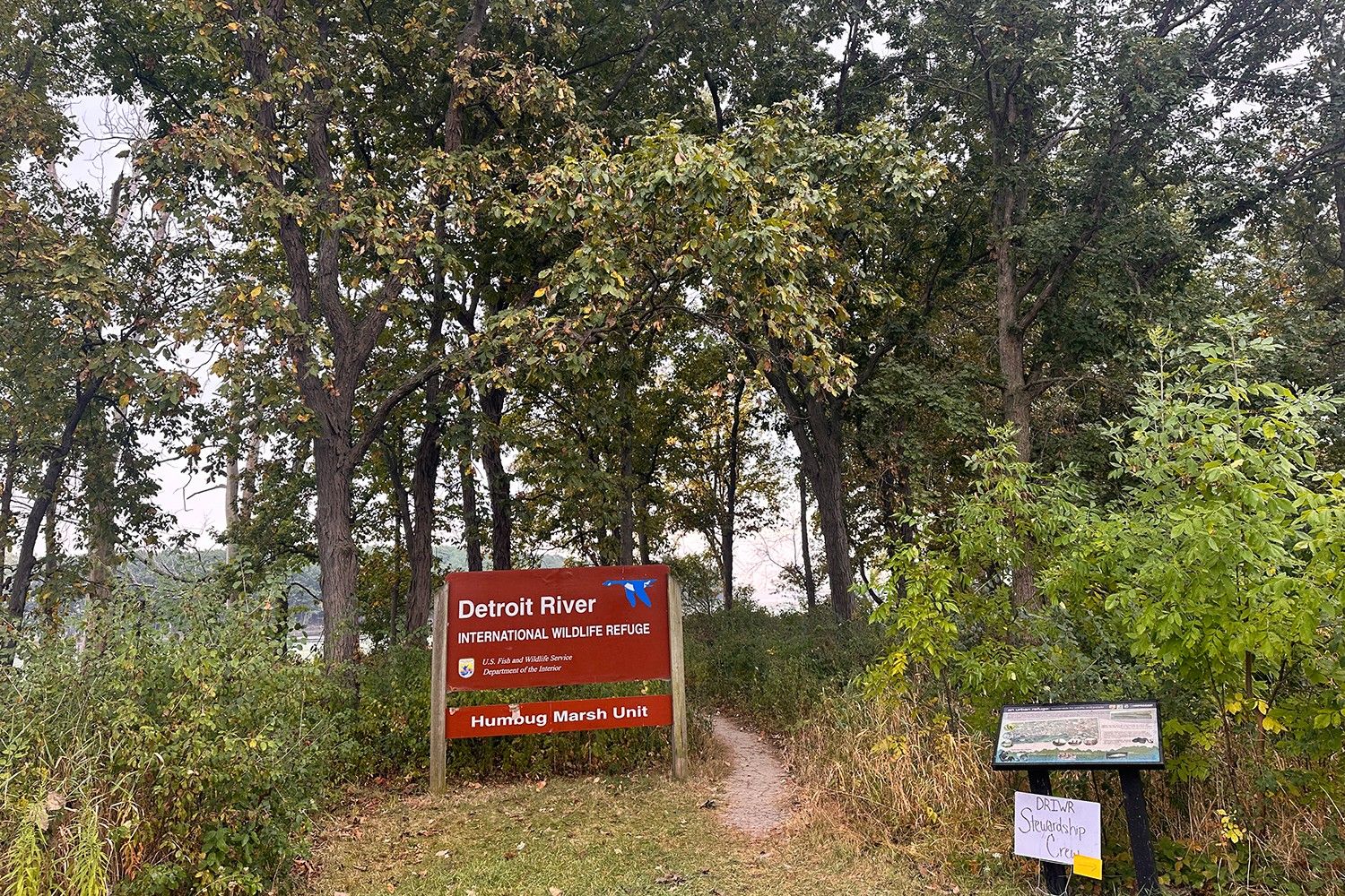 The September morning air carries a hint of chill as we step onto the rustic green trail at Humbug Marsh, the last undeveloped mile of Detroit River shoreline. The gray skies frame the forest of cattails on the banks of the river, and on the other shore, Ontario looks green and wooded. Along the dirt trail, white oak, black willow, red maple, silver maple, American beech, and American elm all compete for which can look the most impressive as their fall leaves change.