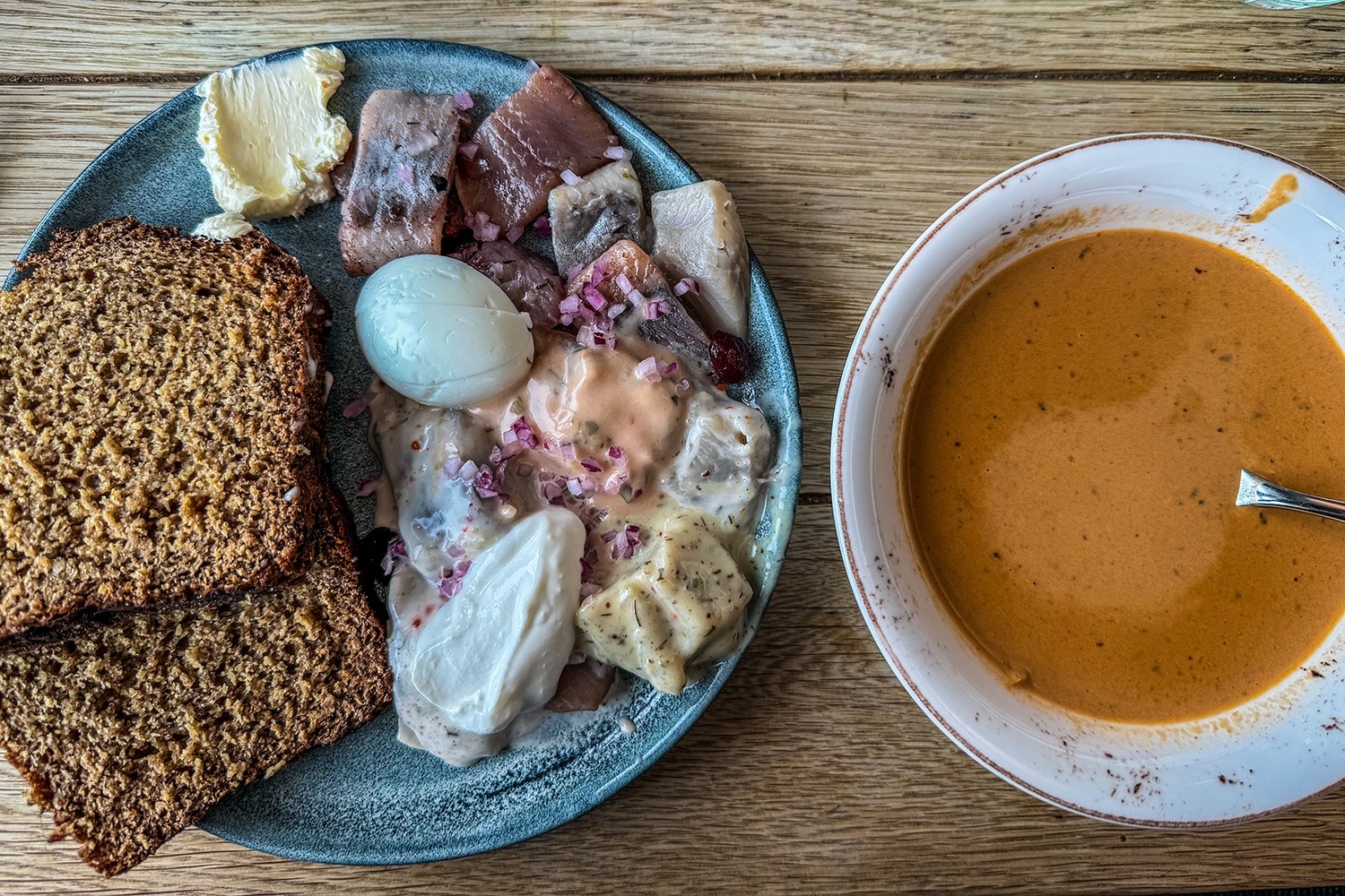 At Salt & Sill, sustainability starts with herring. One of the most climate-friendly fish you can eat, herring is nutrient-rich and easy to catch close to shore, giving it an exceptionally low carbon footprint. The restaurant highlights this with a daily herring buffet—eight varieties with classic fixings like eggs, sour cream, onion, and cheese—and even crowns a “Herring of the Year” each June 6 on Swedish National Day. (In 2025, the winner was brynt smör, or browned butter.)
