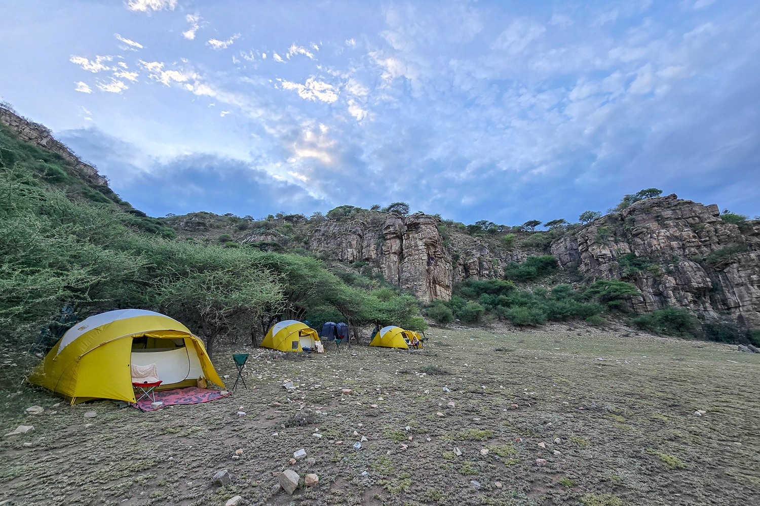 I do, however, join for a side-quest hike after reaching the evening’s campsite, where a handful of tents have been pitched amongst a grove of acacia trees and abundant leonotis nepetifolia flowering in all of their tubular orange glory, giving the camp its nickname: Leonotis.